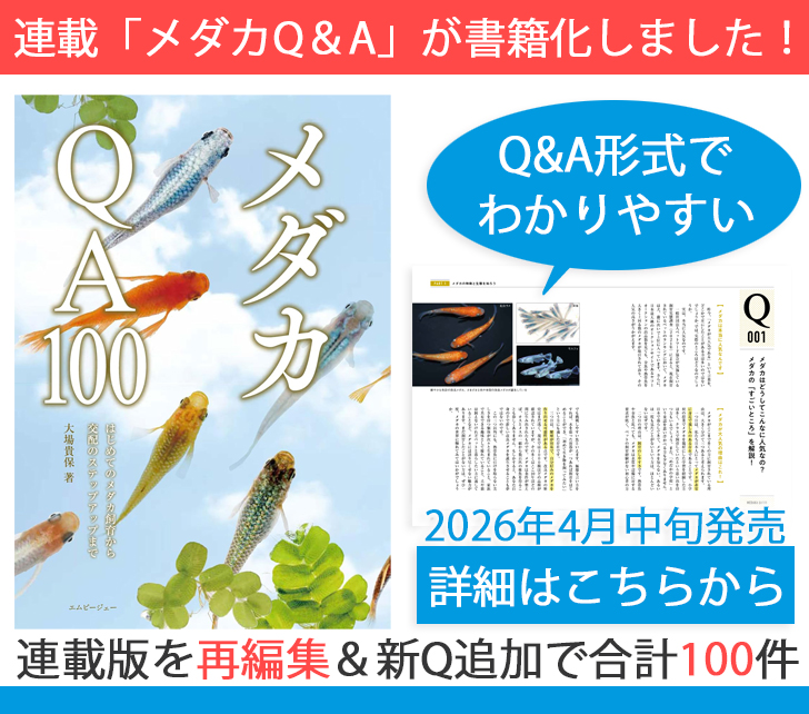 メダカQ&Aとは メダカQ&Aは、専門店にて長くメダカ飼育に携わられている大場 貴保(おおば たかやす)さんに、メダカ飼育の素朴な疑問や繁殖のコツなどについてご回答いただく連載です。メダカ好きの方は、ぜひ興味のある質問から覗いてみてください! |